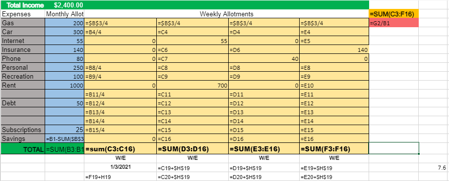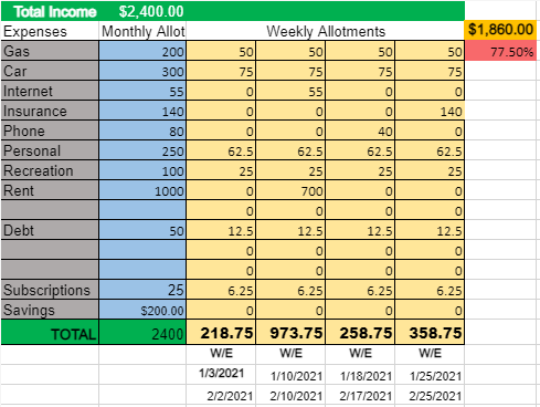 The budget’s allotment structure will depend on each bill’s deadline. You have a monthly column to total all weekly allotments to see them compare against your income, this allows you to see your income and expenses combined result. The weekly allotment columns are where you will have to make sure you record the payments for bills on the week they occur.